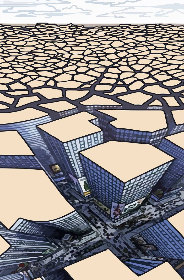 Explore the paradox of progress and emptiness in this painting. Skyscrapers rise like a concrete jungle, their roofs revealing a bird's eye view. Amidst the urban sprawl, a barren land devoid of crops and water, a powerful commentary on the cost of modern development.