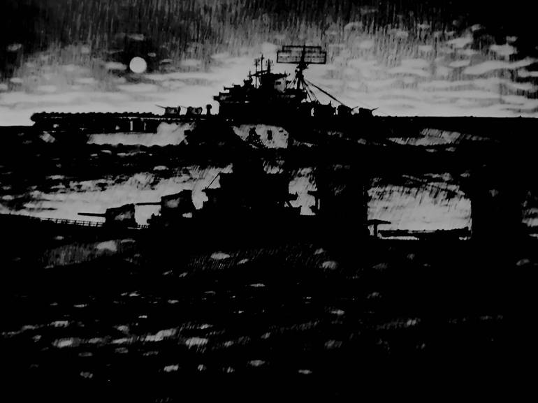 Destroyer passes aircraft carrier in Pacific Ocean 1944 done in black and white in moon light