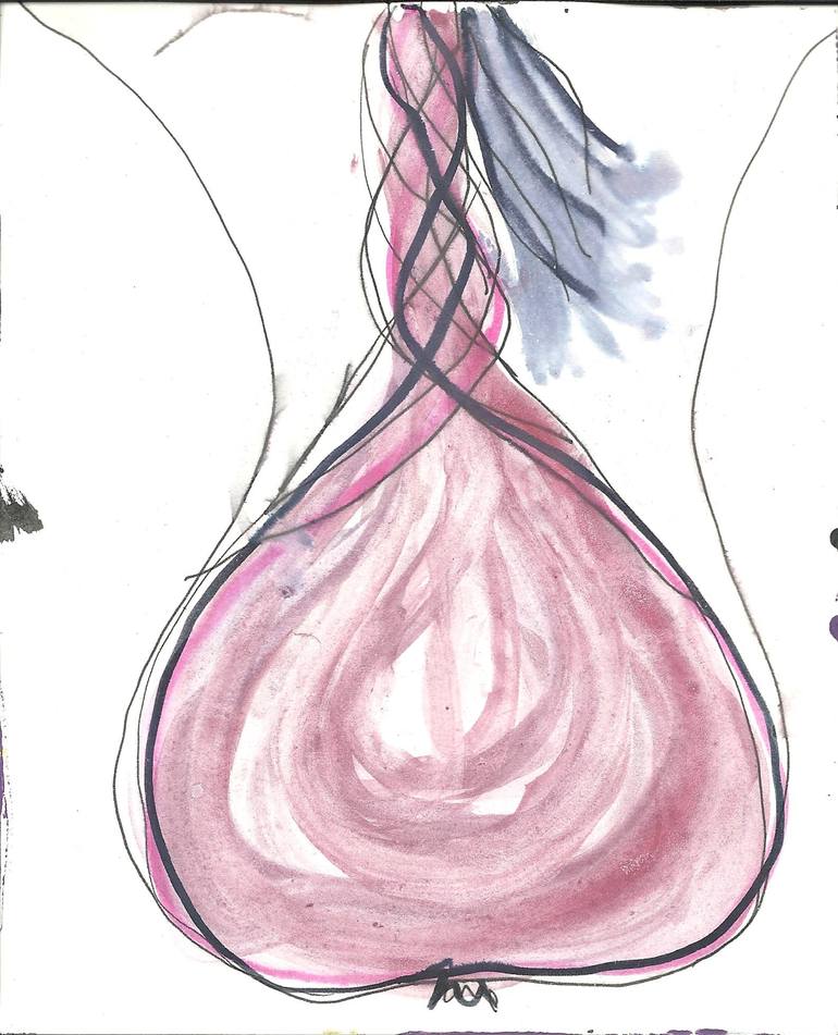 LOWER PART OF FEMALE BACK WITH ONION SHAPED BOTTOM AND BLUE BRAIDED PONYTAIL - this sensual, surreal drawing belongs to a sketches series of surreal nudes on vintage paper what you see is what you get, including the blotches