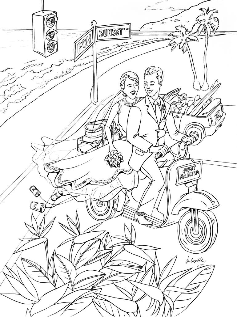 Hang ten for a Malibu wedding. The dolphins even swam by to wish us a happy life together. The original artwork is 18" wide by 24" tall all hand drawn with a Japanese brush pen on white paper. Ready for you to frame and sent to you via a strong cardboard container. You will love this framed by i...