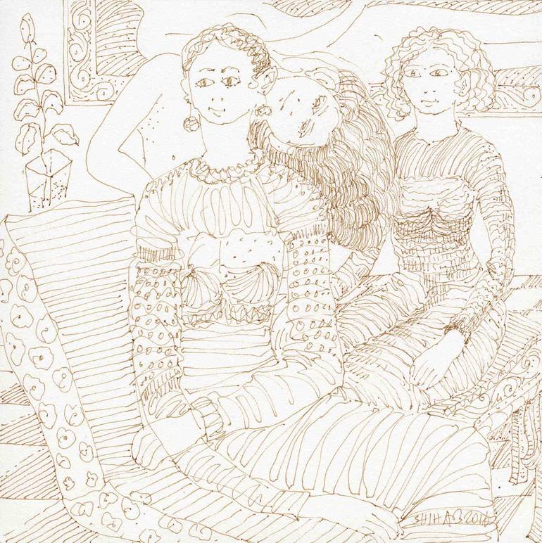 An exciting moment as the models wait to be called onto the stage. It’s all about the dress, the ladies, and their passion for fashion. The fine lines illustrate rhythmic movements flowing around the body. Two friends exchange compliments after setting up for her show.