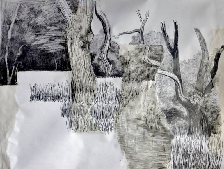 This drawing is based on a series of drawings done on a walk through Epping Forest. Back in the studio I tore up the drawings and rearranged them into a collage. I use this as the starting point for a large graphite drawing, made on cartridge paper with added newsprint paper pieces.