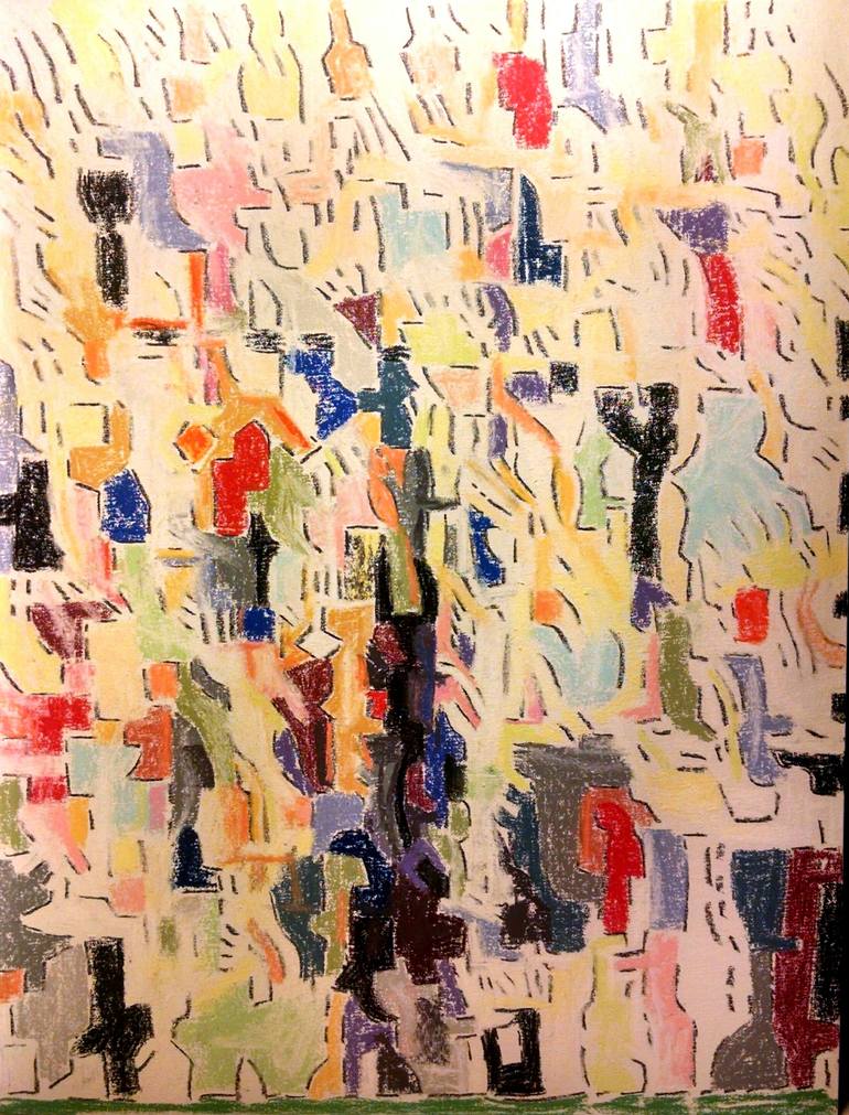 Original abstract drawing on canvasboard. Suspended on canvas stretcher, ready to hang. Part of the Memory Possibilities series. Vibrantly colored, whimsical paintings on canvas and mixed media emerging from a unique process. Each image with its intricate mosaic of positive and negative forms is ...
