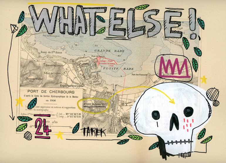 This intriguing artwork merges past and present on an old map of the port of Cherbourg. On this historical canvas, a stylized skull, with its simple yet striking aesthetic, immediately captures the viewer's attention. The words "WHAT ELSE!" in bold letters dominate the composition, suggesting an iro...