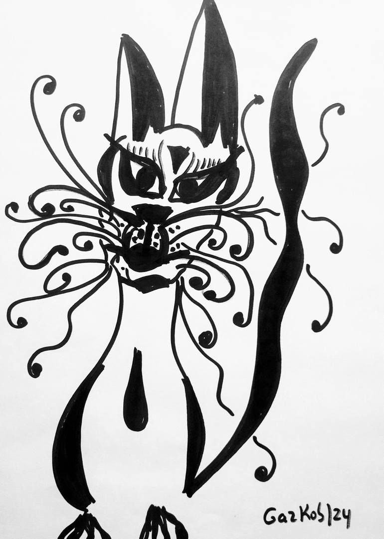 Creation of black & white surrealist cat with big whiskers.