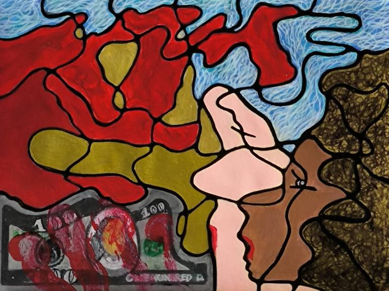 This piece explores the duality of luxury and moral decay, inspired by the atmosphere of white parties, where outward elegance masks the darker side of excess. The intertwined faces in a chaotic composition symbolize the blurred identities in a world of extreme wealth. Money, stained with crimson m...