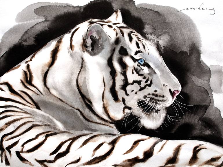 The beautiful white tiger differs from the orange coloured tiger with its blue eyes, pink nose and creamy white fur with black stripes. The tiger (not the lion) is considered the king of all beasts and represents powerful energy in Chinese mythology. Ink and watercolour on Montval artist series Aq...