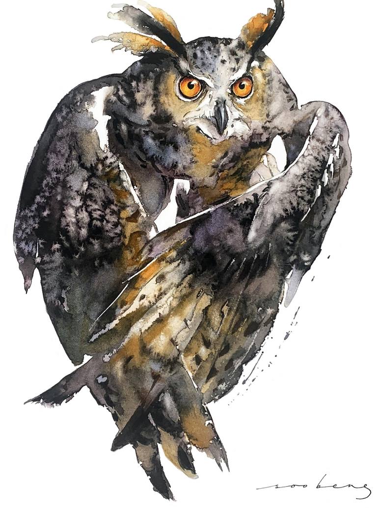 With wings drawn close, the owl embodies stillness, exuding a sense of calm as it surveys its surroundings with piercing eyes. Ink and watercolour on Saunders Waterford 300gsm smooth cotton paper. Photo courtesy from johnbishop67.