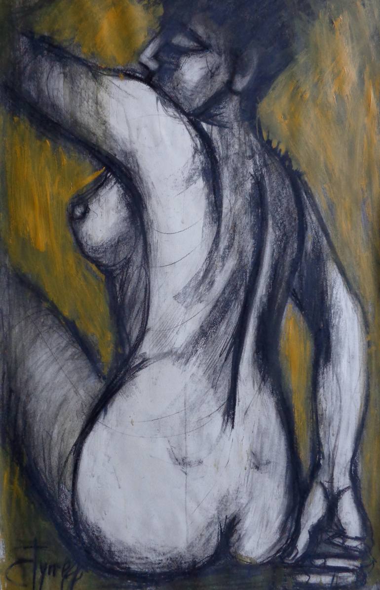 Charcoal and yellow ochre acrylic drawing on paper. Sensual and elegant female nude, image from the rear. Certificate of Authenticity. Deliver professionally fixative protected, wrapped and rolled in a mailing tube.