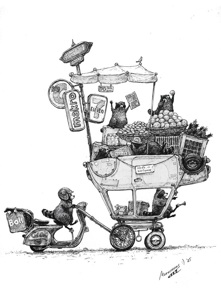 This is the story of a rickshaw reinvented by clever raccoons. What was once a rusty shell is now a lively mobile market — stacked with fruit, cookies, and other treats under a patched-up canopy. Cheerful raccoons wave from above, offering free samples and a warm welcome. The vehicle is decorated w...