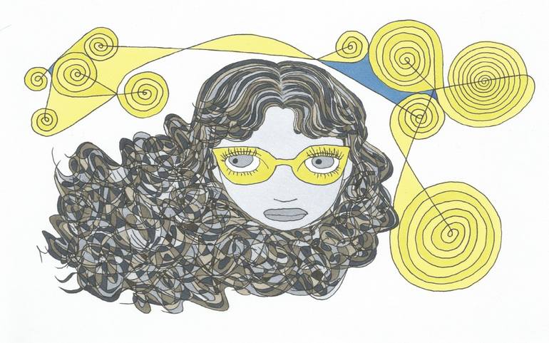 I don't own a pair of sunglasses, but I wear prescription glasses, and often forget to include these things as fashion accessories for my girl drawings. As you can tell from her tangled hair and swirls of yellow thoughts around her, she is a little complicated.