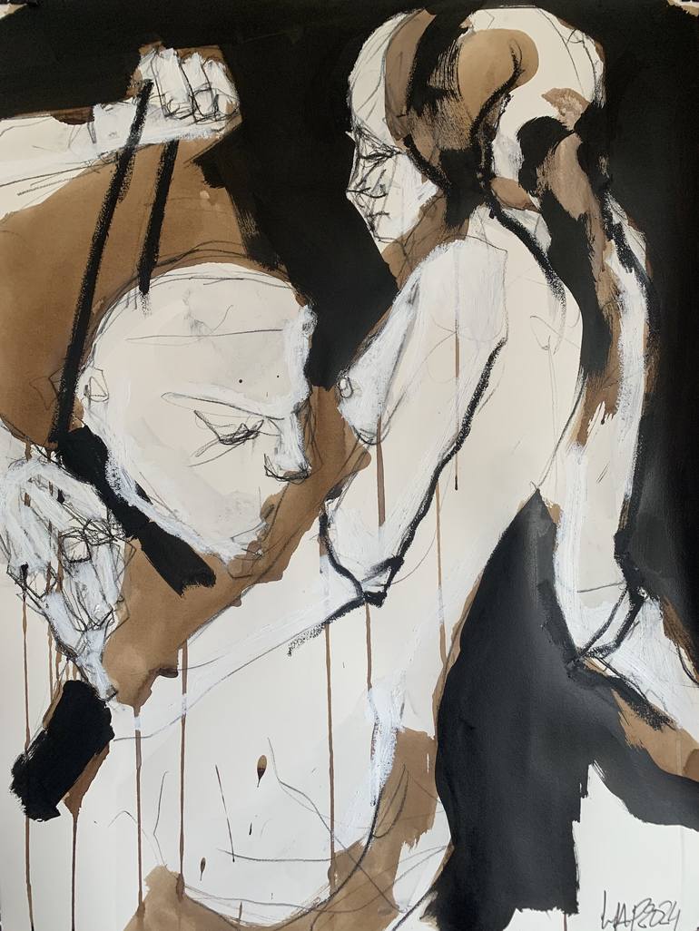This artwork by Laurent Anastay-Ponsolle explores an asymmetric power dynamic between man and woman. The man, in the foreground, appears bent over, almost crushed, suggesting a form of submission. His slumped posture and faint features contrast with the woman’s upright and dominant stance, evoking a...