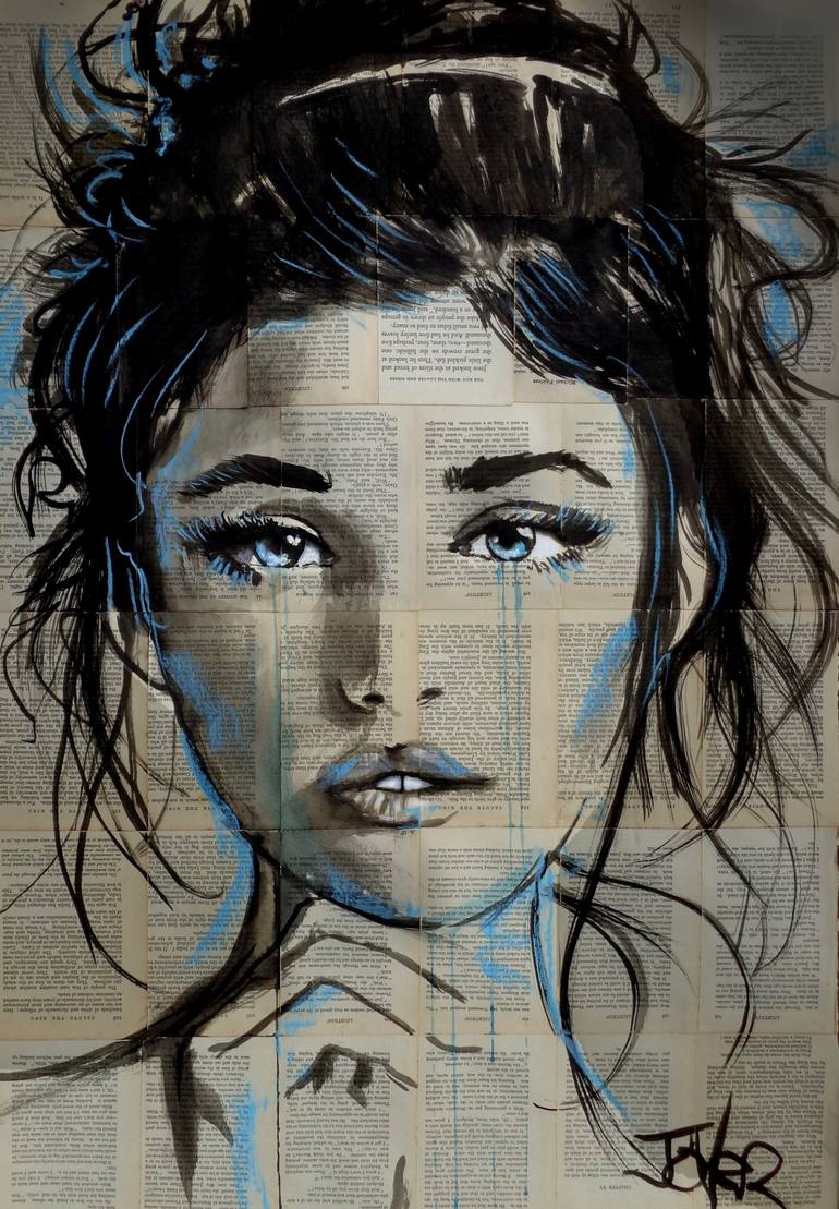 Sumi-e ink, gouache and crayon on vintage book pages adhered together to create one sheet ready for framing as desired, part of an ongoing series of works created over the past ten+ years featuring women and their emotions .. very popular with collectors worldwide, I am the ''original'' creator of t...