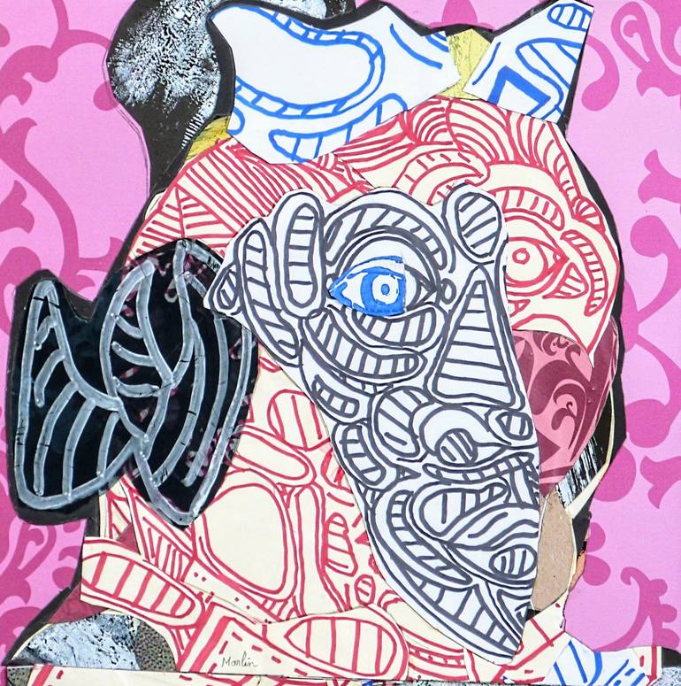 This original mixed media drawing on paper, titled "bonhomme," is a captivating exploration of the human form. The artist employs a combination of marker, acrylic and collage techniques to create a visually striking portrait. The bold use of red and blue against a black backdrop draws the eye, while...