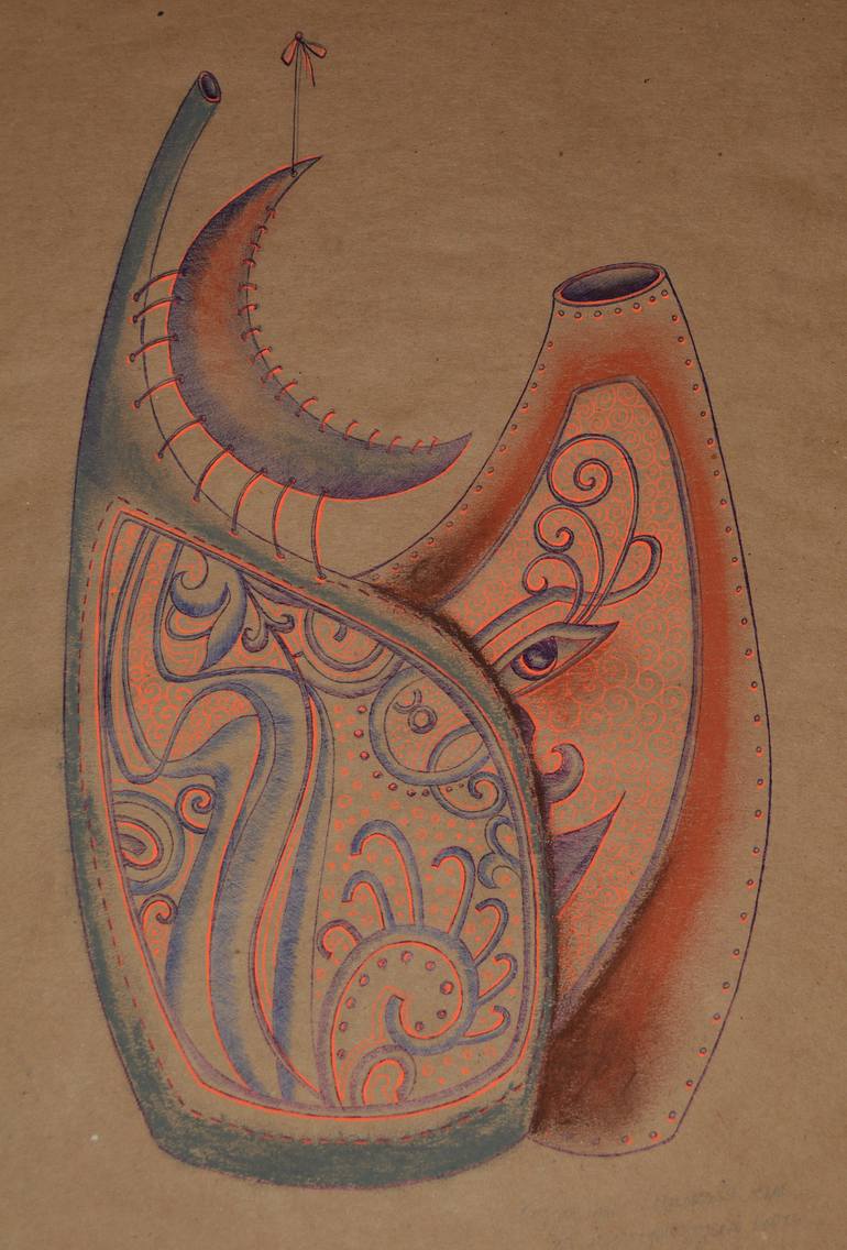 To create a unique image I was inspired by the natural phenomenon of day and night, the changing light on the sky, changes in the nature and rules of all life on Earth with the change of light. Graphics done with a ballpoint pen on aged paper and colored with pastels .