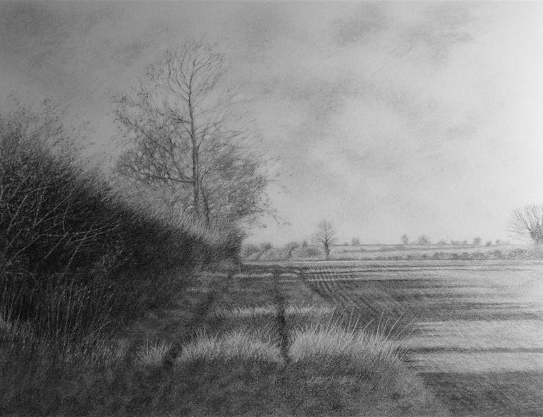 Hedgerow november morning is a charcoal drawing on arches 300lb not paper .Based on an early morning visit along a country lane in Norfolk UK. my work is influenced by the farmland surrounding my home in suffolk,uk.The drawing has a black wooden frame and off white 3.5 inch mount and is ready to han...