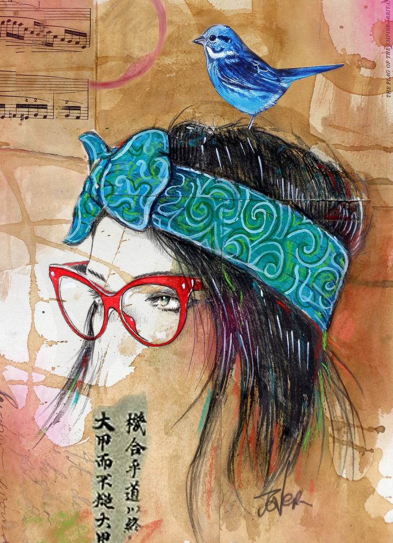 this work forms part of the ongoing series bird, bandana and glasses, a series of small mixed media drawings created on vintage front and end pages from vintage books using pencil, gouache, ink, merlot wine, paper and a common seal stamp, featuring my signature Bluebird of happiness hand drawn then ...