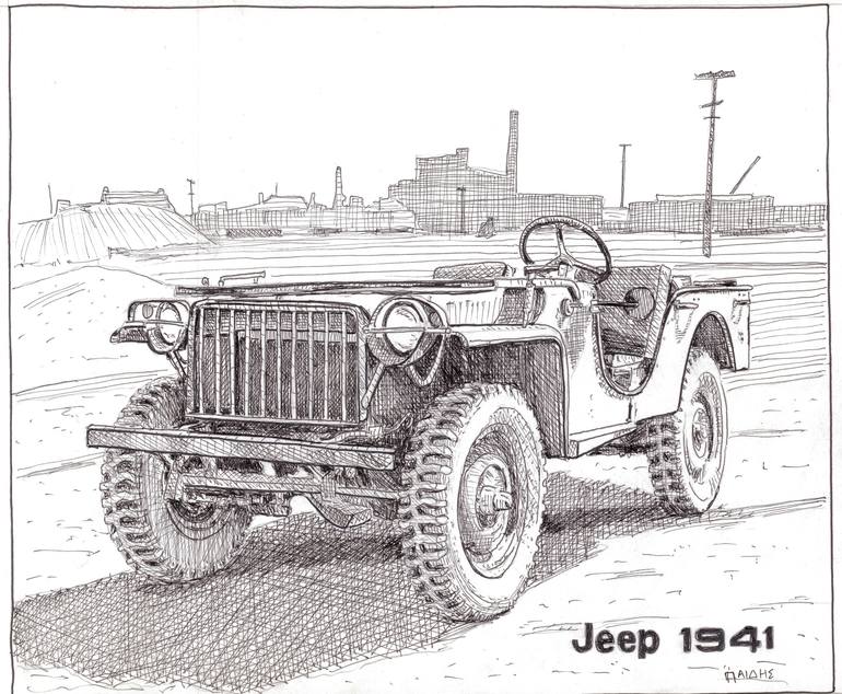 A dynamic and detailed portrayal of a Jeep, capturing its ruggedness and utility. The drawing emphasizes the vehicle’s robust structure and its ability to conquer tough terrains. The use of bold lines and strong contrasts adds a sense of power and motion, bringing the Jeep to life on the paper.