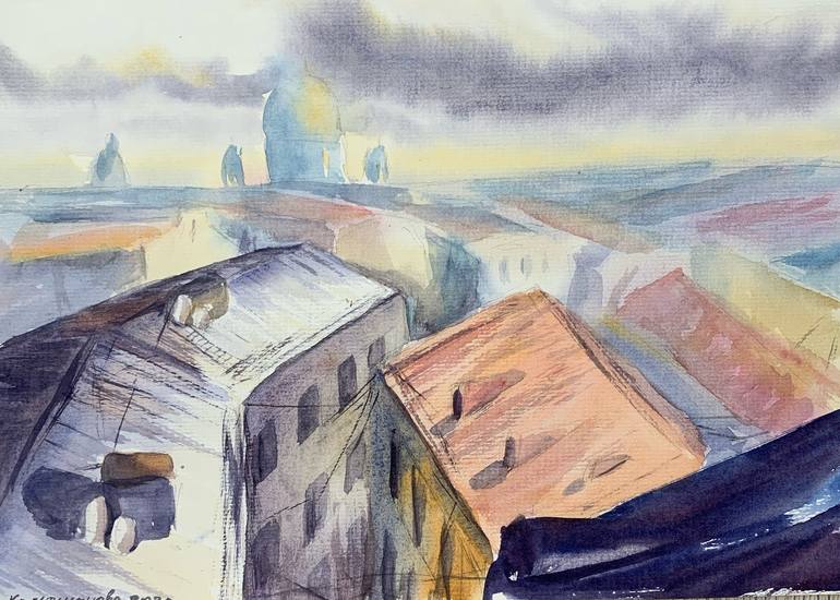 The center of St. Petersburg is filled with low old houses. You'll be lucky if you have a friend who has access to one of the roofs. You will be able to enjoy a wonderful view of the city. This picture is painted with the memory of such a walk. You’ll need to frame the watercolor under the glass to...