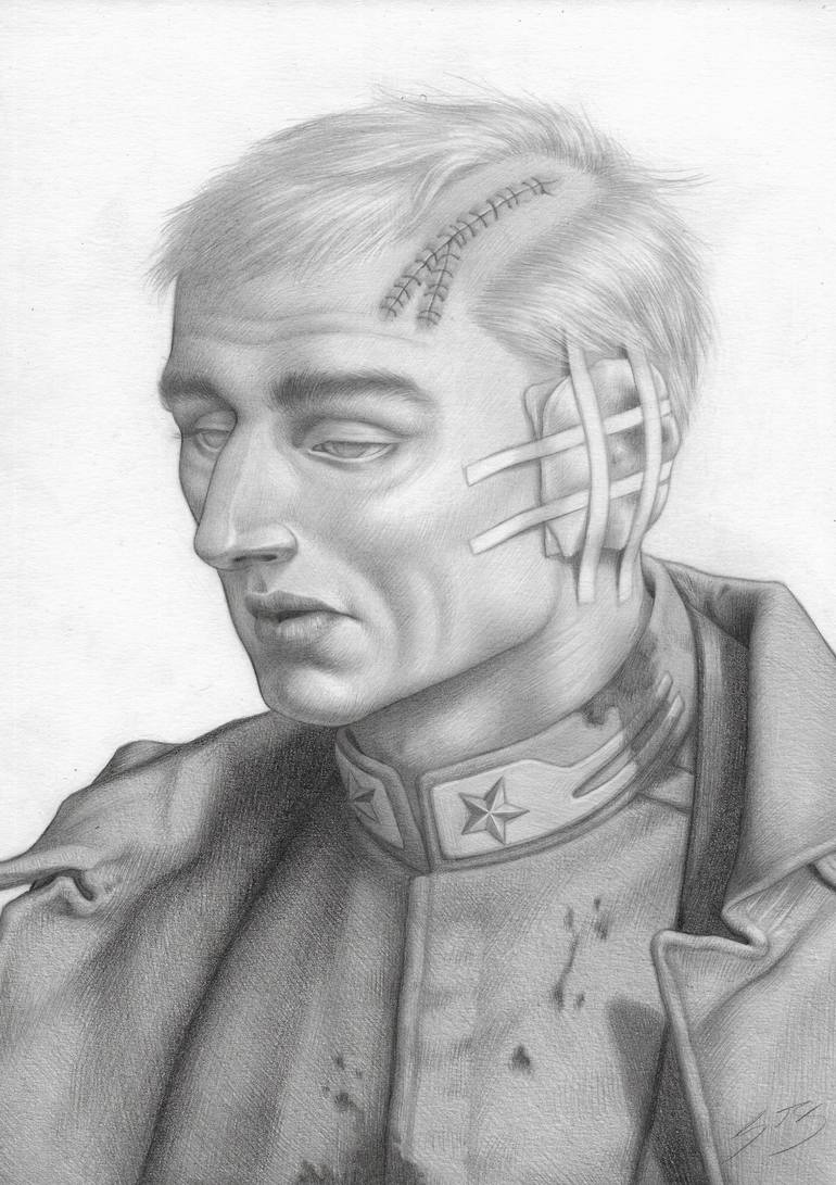 Half-length portrait of a soldier of the First World War in a state of shock, reference used for the uniform but not for the face, which was made from imagination