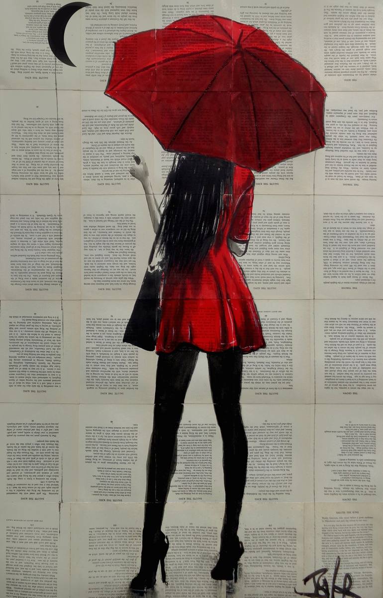 this piece forms part of the red umbrella rain lovers series of very popular works an ongoing series using ink and other mediums featuring couples and or lone figures , begun over ten plus years ago , more than 100 works now make up this ongoing series , this work was drawn on vintage book pages adh...