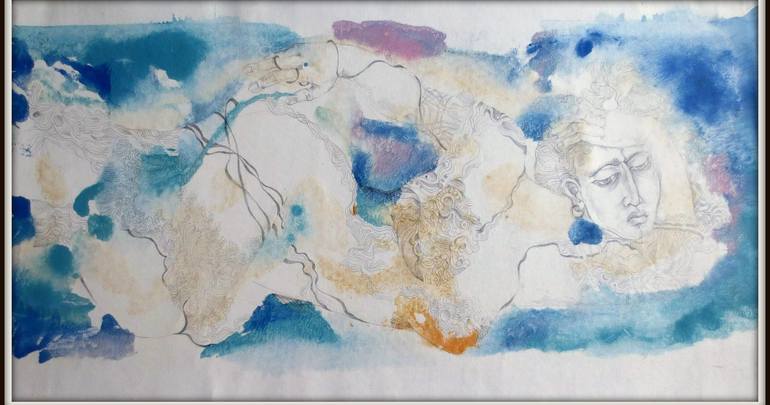 i made this drawing of a woman lying in the process of working on mono type , the picture fits into the space of blue spots , as the body of a woman created from clouds , with a light pencil drawing of a figure and an ornament , i will be glad if you like this work.