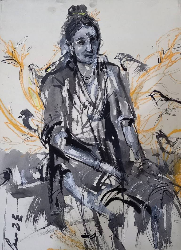 it it narmal drawing of my sister,with ink and dry pastel on paper.