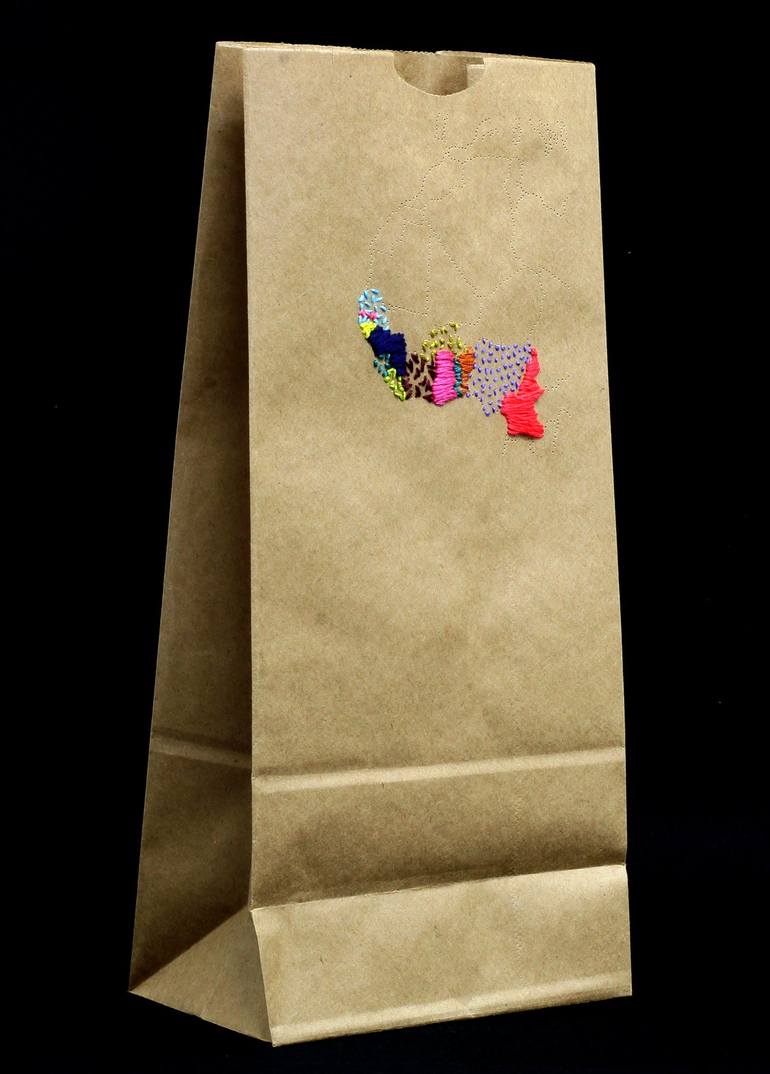 Trace a map with needle hole. Then embroidering a map on brown craft lunch bag. A map on brown craft lunch bag in a room express quiet and peaceful world, though some nations has been having conflict. material: brown craft bag, thread