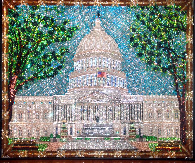 I'm professional beadwork artist. This is my largest beadwork with rhinestone mosaic. I created it being inspired by my visit to Washington DC. Beads, sequins and large size Swarovski Crystals are sewn on canvas. Rhinestones are mosaic, glued to canvas. Part of small beads are also glued. You can se...