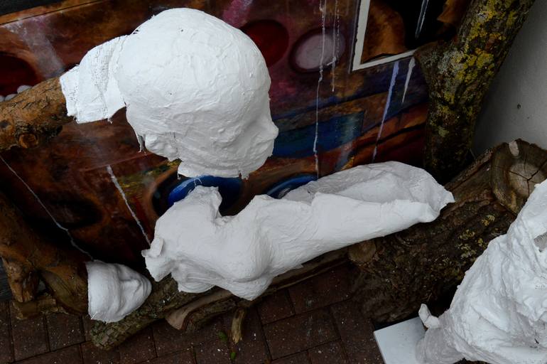 These prints are a development from the main painting. Natural wood has been placed alongside the white plaster sculptures to represent a transition and the natural ageing process.