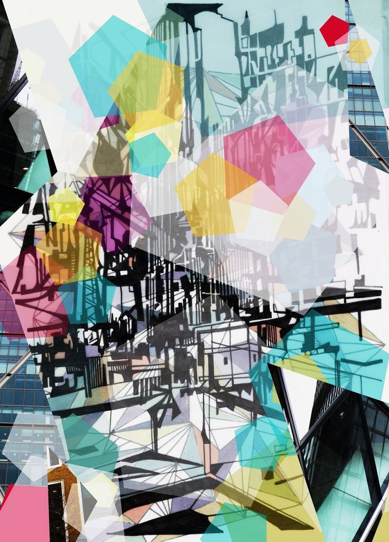 My work is focused around the idea of the "˜urban maze', which is a chaotic, lively and constantly changing place. When in the built environment the eye is constantly distracted, it is drawn to one thing and is almost immediately attracted to something else and this is what I aim to convey within my work. I work with the decomposition of photographs to create new images. By decontextualising and recomposing locations around the city in this case London, it is my intention to create fragmented compositions that question our sense of perception. The new images are slightly skewed from their originals and it is this fragmentation that highlights a kind of "˜architectural kaleidoscope' as one is overwhelmed by the urban environment. The starting point for this work came from studying the Vorticisists and their appreciation of the dynamism of the modern age which is always a constant reference point for my work. In thinking about the Vortex, "˜It is a violent central activity attracting everything to itself, absorbing all that is around it into a violent whirling- a violent central engulfing.' This is a key theme that runs throughout my work- a lack of a clear focal point means the eye is constantly moving as the viewer becomes enveloped in the image. Reading Italo Calvino's text Invisible Cities he describes the built environment in many different ways, the most important for my work being, "˜Cities like dreams are made of desires and fears, even if the thread of their discourse is secret, their rules are absurd, their perspective deceitful and everything conceals something else." This text has been key in developing my working methods, particularly in terms of the idea that everything is concealing something else. It is this which led me to working with many different layers in one composition. When making the work I try and place myself back in the city in order to be able to make a more valid statement within an image. Photography is essential to my work; I begin by tracing lines from different buildings and joining them together to create one image. It is this that begins to contribute to the chaotic and overwhelming feeling of being in the urban maze. These drawings are then reworked onto a larger scale and printed onto canvas. Layers of collage and paint are then applied to the surface which brings the image to life and the composition becomes overloaded with information. Pattern is particularly important in the second layer of my work.