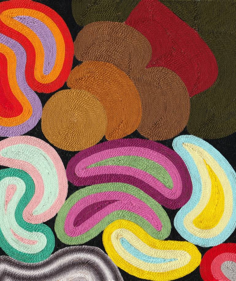 Not a painting, but cotton thread patiently and meticulously glued to a wood panel. A one-of-a kind art piece that will brighten your mood and space. Part of the abstract Fauna collection. A stylised bug, a scarab, navigating amongst cellular, colourful creatures. This piece was inspired by the t...