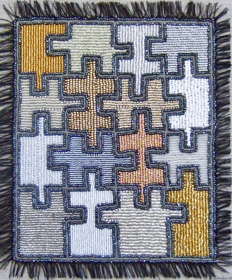 This Seed bead embroidery is designed using glass beads that shine and glitter interlocked in a puzzle shaped geometric format. The work is hand stitched atop a 12" x 12" linen canvas and has a peyote stitched beadwork edging and knotted thread fringe. The artwork is supported within a black floatin...