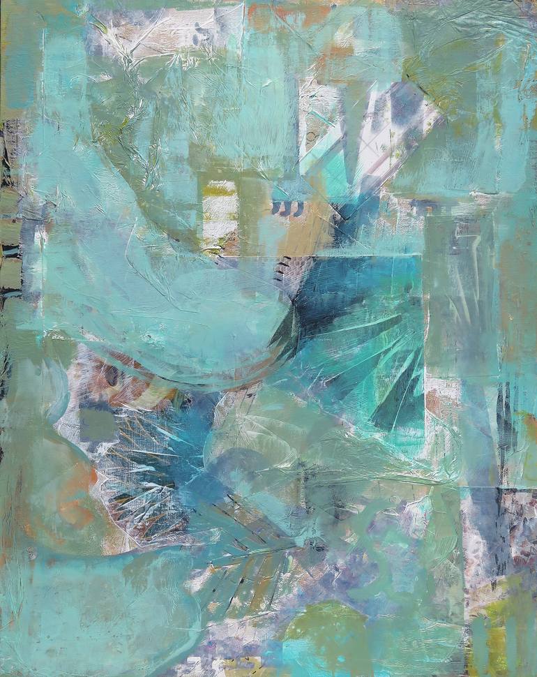 This work was done in layers and in an intuitive process. I'm never sure where a mixed media piece will end up so I just try to go with the creative flow. There is a girl embedded in this work. She's from one of my old paper dolls. See if you can find her floating in this painting. This was don...