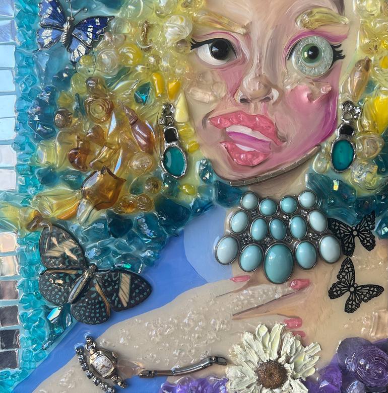 Aria means beautiful voice. Aria sings and can’t help but attract whimsy, light, & dreams. She embodies imagination with her siren songs. Aria is composed of a wide array of media; including oil paint, glass, mirrors, jewelry, & found objects. This work has many layers, like Aria’s soulf...