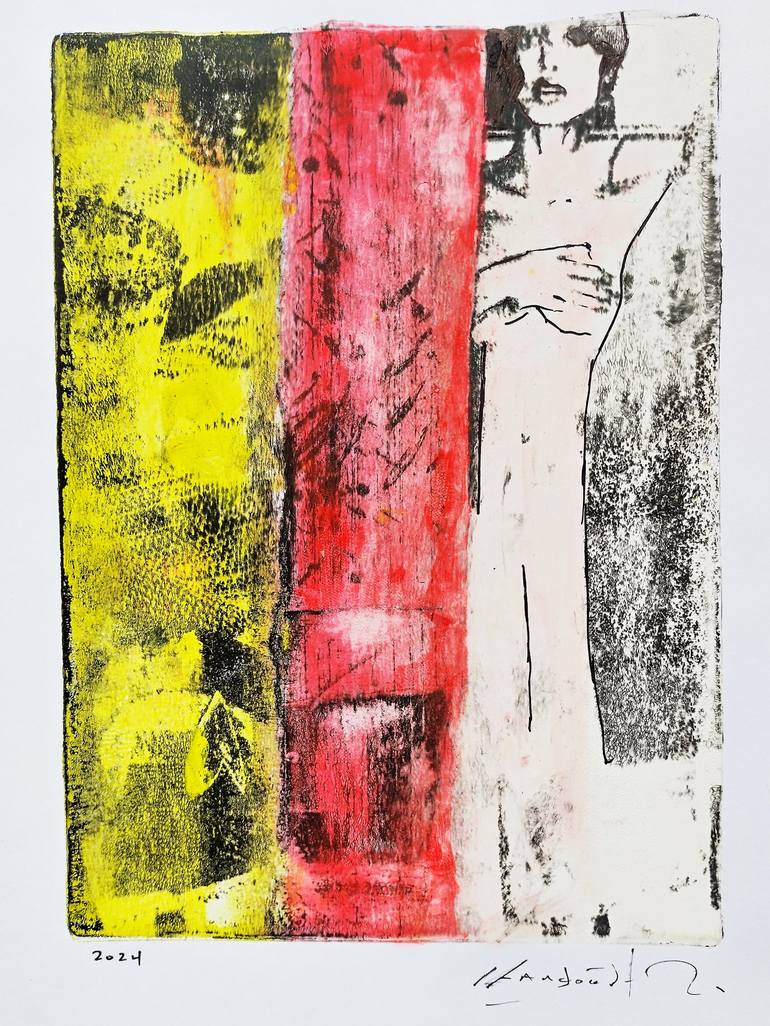 Gel Printing monotype technique on fine art satin paper 200gr. using mixed techniques of coloring with acrylics, china ink, graphite and collage. Comes in a black 18x24 cm MDF frame with a lightweight plastic front.