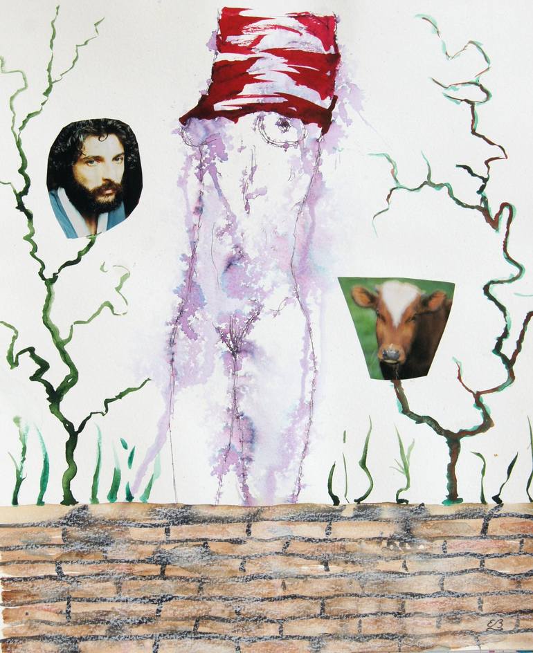 Surreal body drawing, with collage and watercolor on watercolor paper.