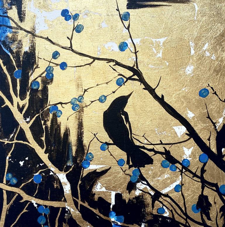 Stretched Canvas 12x12in, used natural gold leaf, silhouette drawing depicts a bird on the branches of a tree. I tried lacanically and expressively to convey that transitional state of nature. Flying also implies emotional freedom. The whole world is open to birds. They are endowed with a gift that ...