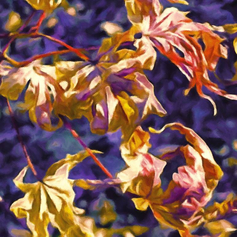 A digital oil painting on canvas of the Japanese coral maple tree in our Chester County, PA backyard, in vibrant hues of green, purple, gold and red on an abstract blue background.