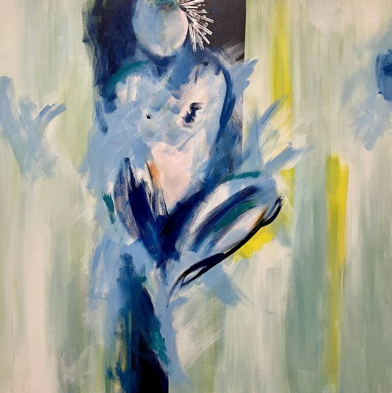 This blue and green abstract composition depicts the outline of a seated human form with dynamic brushstrokes. The interplay of light blue, white, and dark tones creates a sense of movement and fluidity. I was inspired while sitting on my yoga mat….