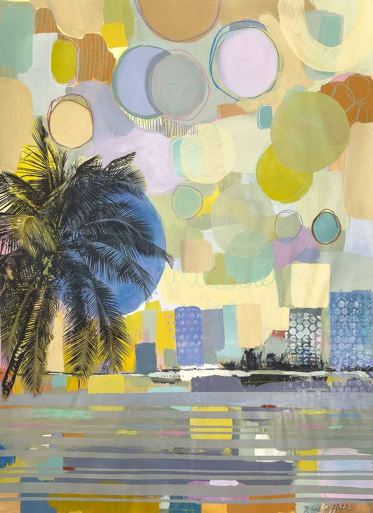 The artwork presents a vibrant and abstract interpretation of a coastal cityscape. A prominent palm tree is set against a backdrop of large, overlapping circles in pastel colors, ranging from soft blues and greens to yellows and pinks. Below the circles, a series of colorful rectangular shapes repre...