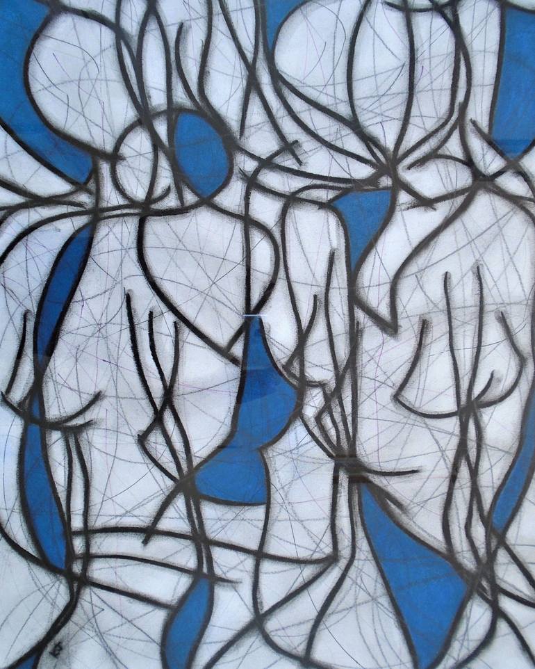 Multiple-image, semiabstract composition using the female form and the colour blue; a strong expressionist work. Presented in a white box frame which is constructed of wood and is glazed. Fixed with professional fixative and framed.