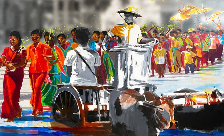 Manipulated Black and White Photography, printed on fine art paper, with acrylic painting on top. The motive is inspired by a celebration in Myanmar and some working people at the seaside in south India.