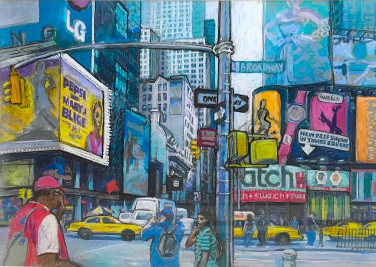 The hustle and bustle of New York is captured here . The yellow cabs are weaving in and out . Tourists are taking photos - all this inspired me. I tried to show this in these busy bustling streets of New York. I love New York and the colour and frenetic pace of the city. The colour of the advertisem...