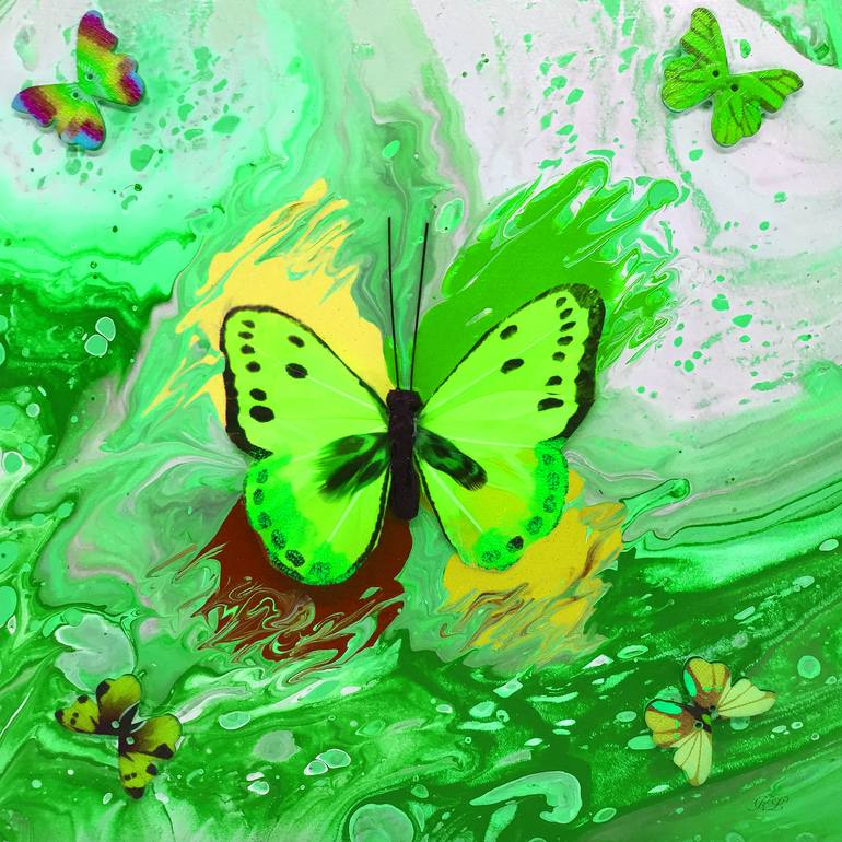 Based off my original painting, Butterflies in Flight, I have manipulated the colors to glow more in the orange and rainbow colors. The original painting was an acrylic pour in the cream and beige colors. There are butterflies placed in the paint of the original and made the painting 3-dimensional...