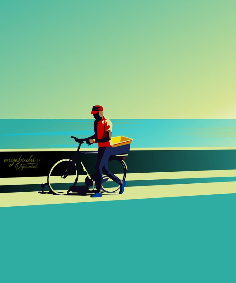 A man dragging his bicycle By The Cool Sea in Lagos, Nigeria.
