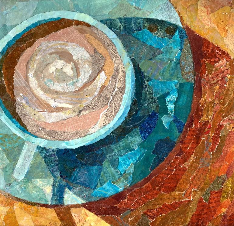 This method of painting involves many steps, including several days of making monoprints with acrylic paint onto various papers (old maps, sheet music, book pages, rice paper, etc.). I let the prints dry and then separate them by color. I then choose just the right hue and value of paper, tear it in...