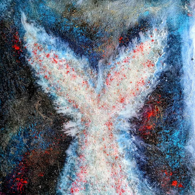 A conceptual abstract painting evoking the image of a celestial being — perhaps an angel, a whale, or a soul — ascending through cosmic darkness. The dynamic textures and rich contrasts of white, red, blue, and black pull the viewer into a space of transformation, mystery, and spiritual motion. The...