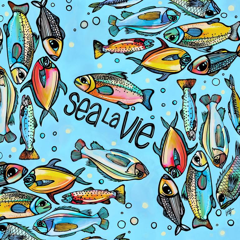 Bright and whimsical illustration featuring a variety of colorful fish with the playful text "Sea La Vie," creating a lively and joyful aquatic theme.