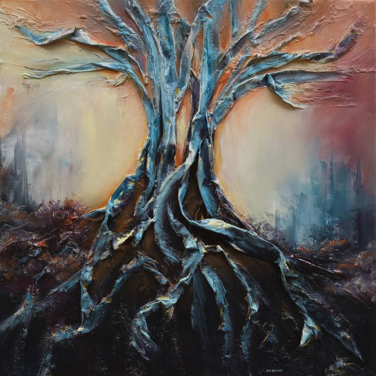 "Connection" is an abstract landscape painting. It is part of the collection "the tree and the canoe". The relief created from cardstock anchors the roots in the paintings. The light source at the center of the roots calls for self-knowledge surrounding the bonds of the family to build our own ident...